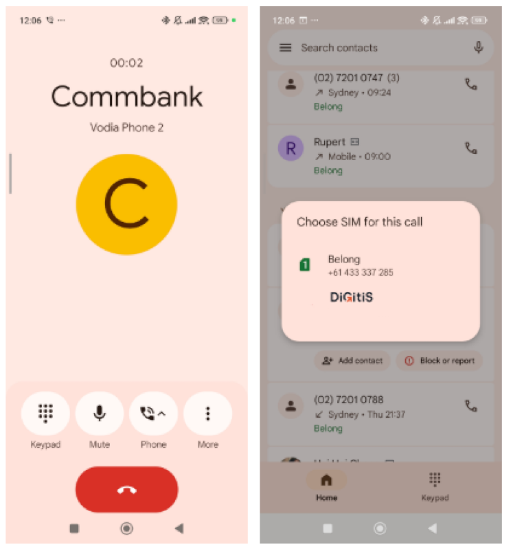 Depuis le composeur du téléphone : composez le numéro normalement. Votre téléphone vous propose de choisir avec quelle ligne appeler — sélectionnez Digitis.
