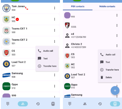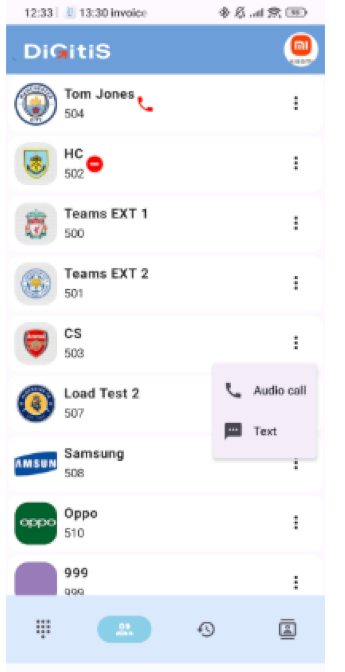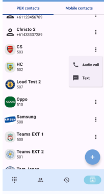 Le carnet d’adresses partagé de votre société. Appuyez sur les 3 points pour appeler ou envoyer un SMS.