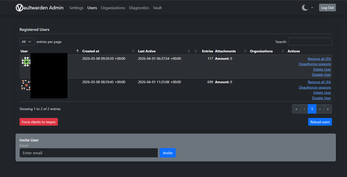 Le panneau d'administration vous donne une vue d'ensemble de tous les comptes créés sur votre instance.